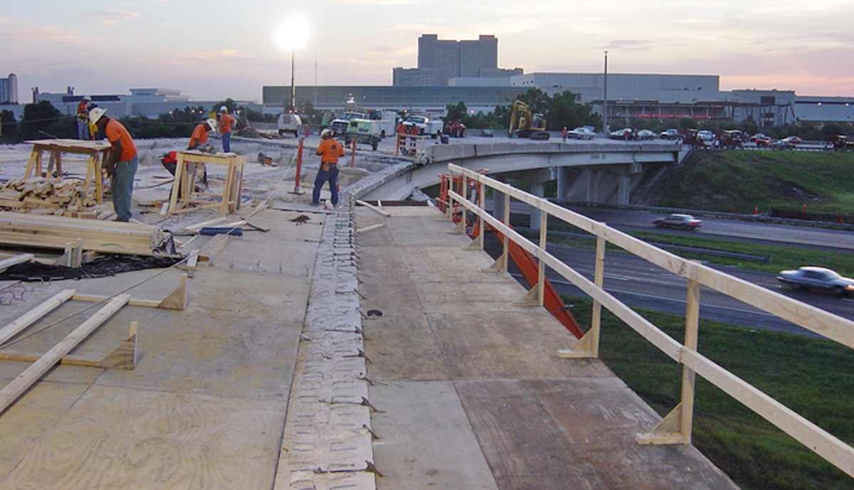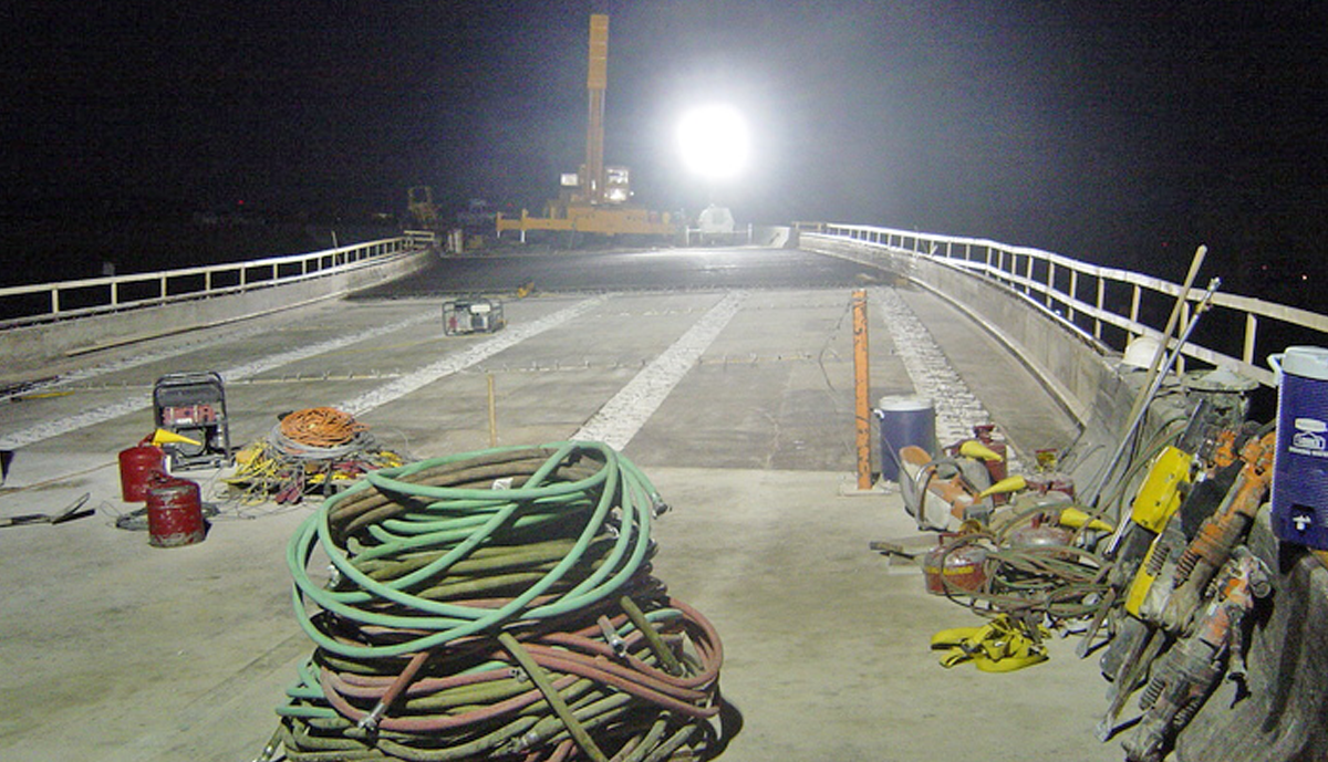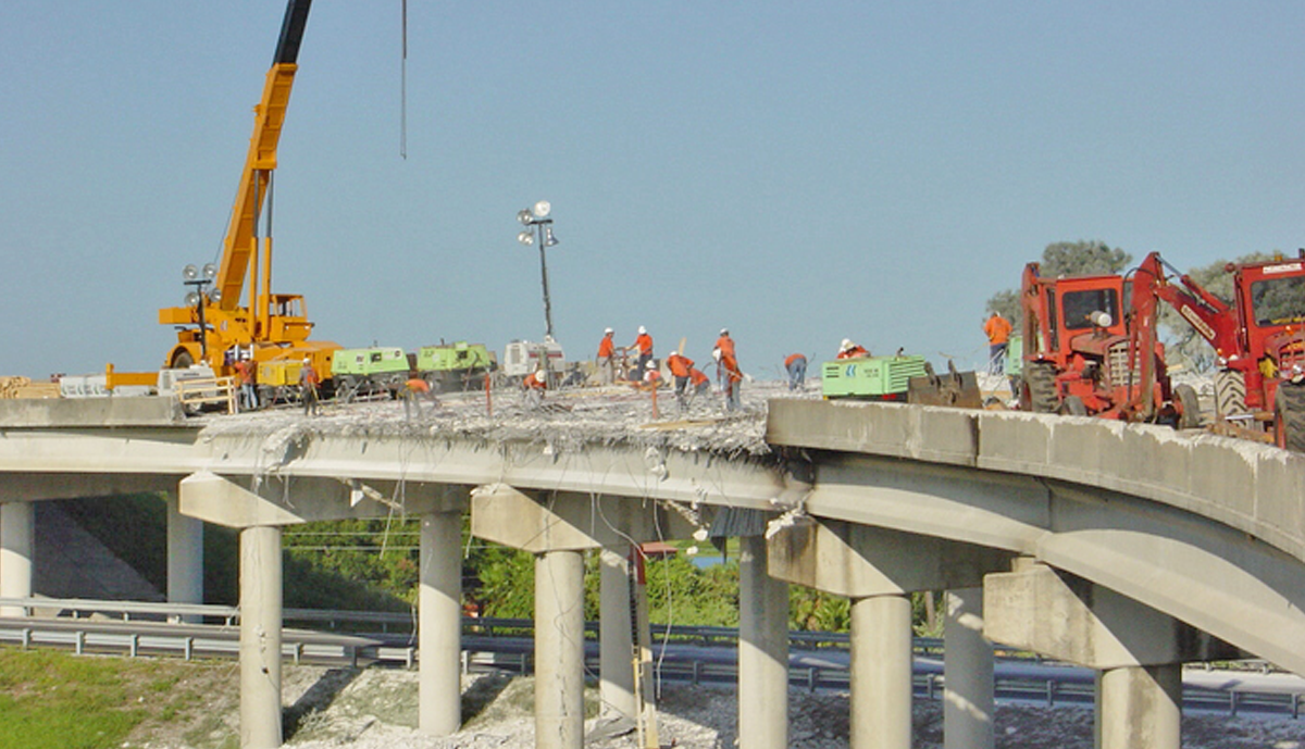 In mid-August of 2002 an accident occurred on Ramp “B” over I-4 in Orange County causing the closure of this heavily traveled flyover connecting SR-528 to the westbound lanes of I-4. A tanker truck full of diesel fuel lost control and overturned, spilling its’ load which ignited on the deck of Ramp “B”. Two spans of deck (152’) and 609’ of Traffic Railing Barrier were structurally damaged as a result. Traffic was temporarily diverted in order to maintain access to I-4. The Florida Turnpike Enterprise awarded Leware a contract , and we immediately mobilized our forces and began work. Repair procedures called for the removal and replacement of the damaged deck and traffic barrier, which was accomplished ahead of schedule.