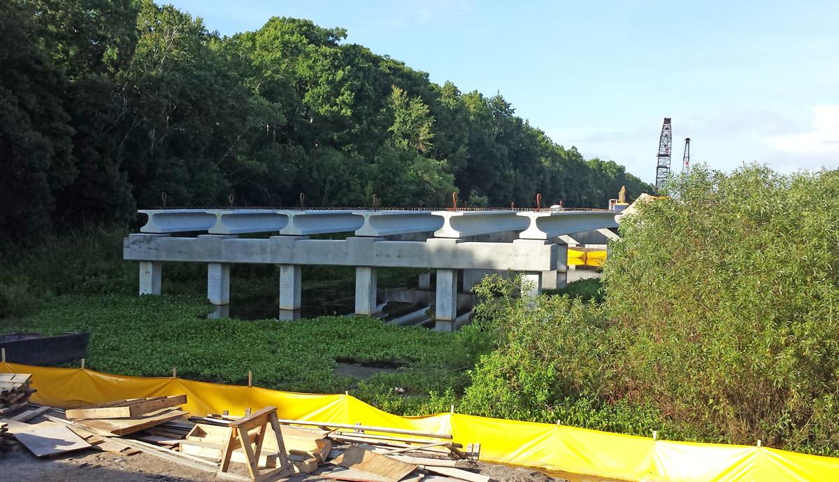 This project includes the complete reconstruction of I-4 between Deland and Daytona. Our subcontracted work includes construction of two ramp bridges over I-4 and US 92, multiple animal crossings, and the removal and replacement of the existing low level bridges over the Tomoka River. Early completion of the Ramp B bridge over US 92 was vital to the project to relieve congestion during Daytona International Speedway events. To add another level of aesthetics, the new Ramp A bridge over I-4 was the first slipformed, stamped barrier wall constructed in Florida.