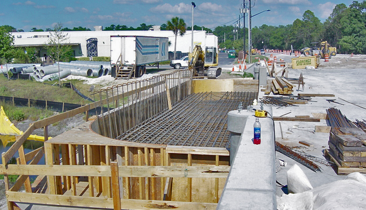 Located just off campus from the University of Florida, this bridge replacement project entailed the removal of an antiquated two lane bridge along with an accompanying pedestrian bridge. These two structures were replaced with a single Bridge, 97’2” wide and 120’ long, consisting of three 21” thick, cast in place spans. The center span incorporated extended observation platforms complete with seating and architectural finishes.