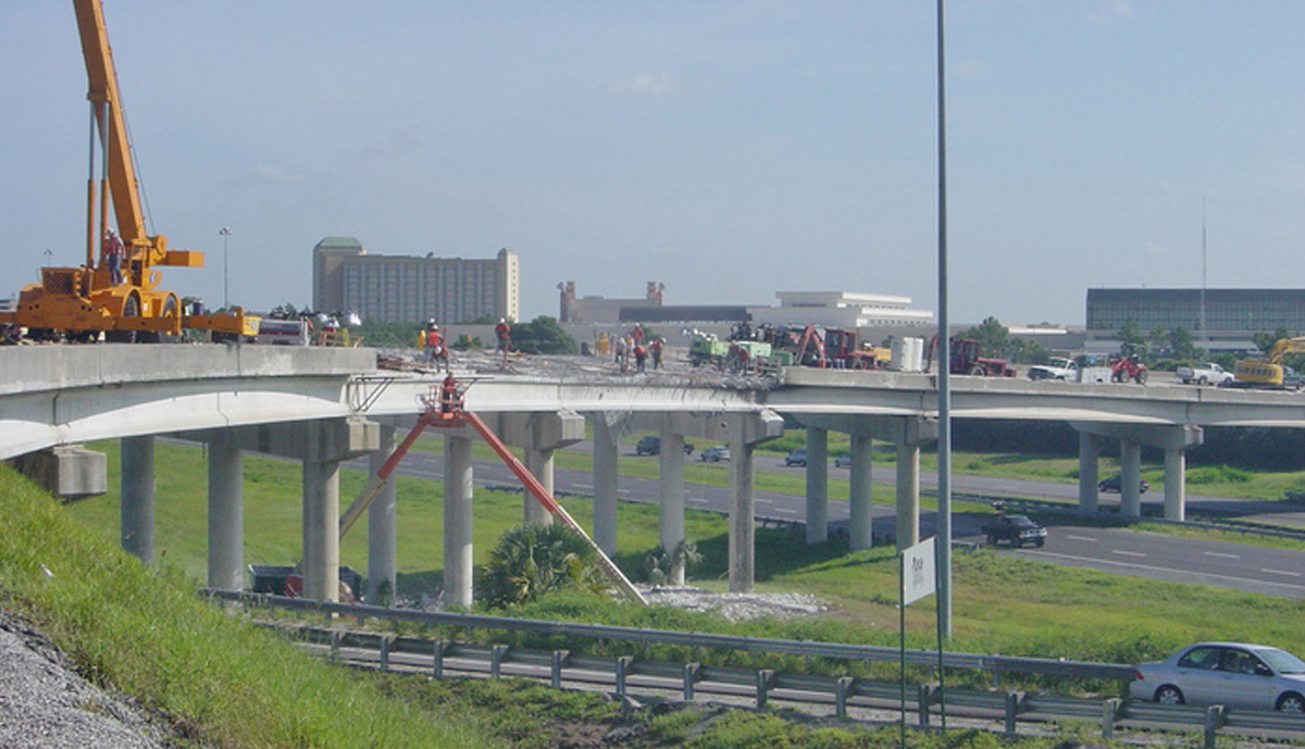 In mid-August of 2002 an accident occurred on Ramp “B” over I-4 in Orange County causing the closure of this heavily traveled flyover connecting SR-528 to the westbound lanes of I-4. A tanker truck full of diesel fuel lost control and overturned, spilling its’ load which ignited on the deck of Ramp “B”. Two spans of deck (152’) and 609’ of Traffic Railing Barrier were structurally damaged as a result. Traffic was temporarily diverted in order to maintain access to I-4. The Florida Turnpike Enterprise awarded Leware a contract , and we immediately mobilized our forces and began work. Repair procedures called for the removal and replacement of the damaged deck and traffic barrier, which was accomplished ahead of schedule.