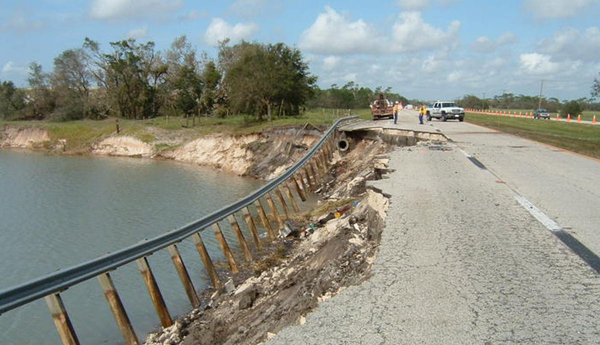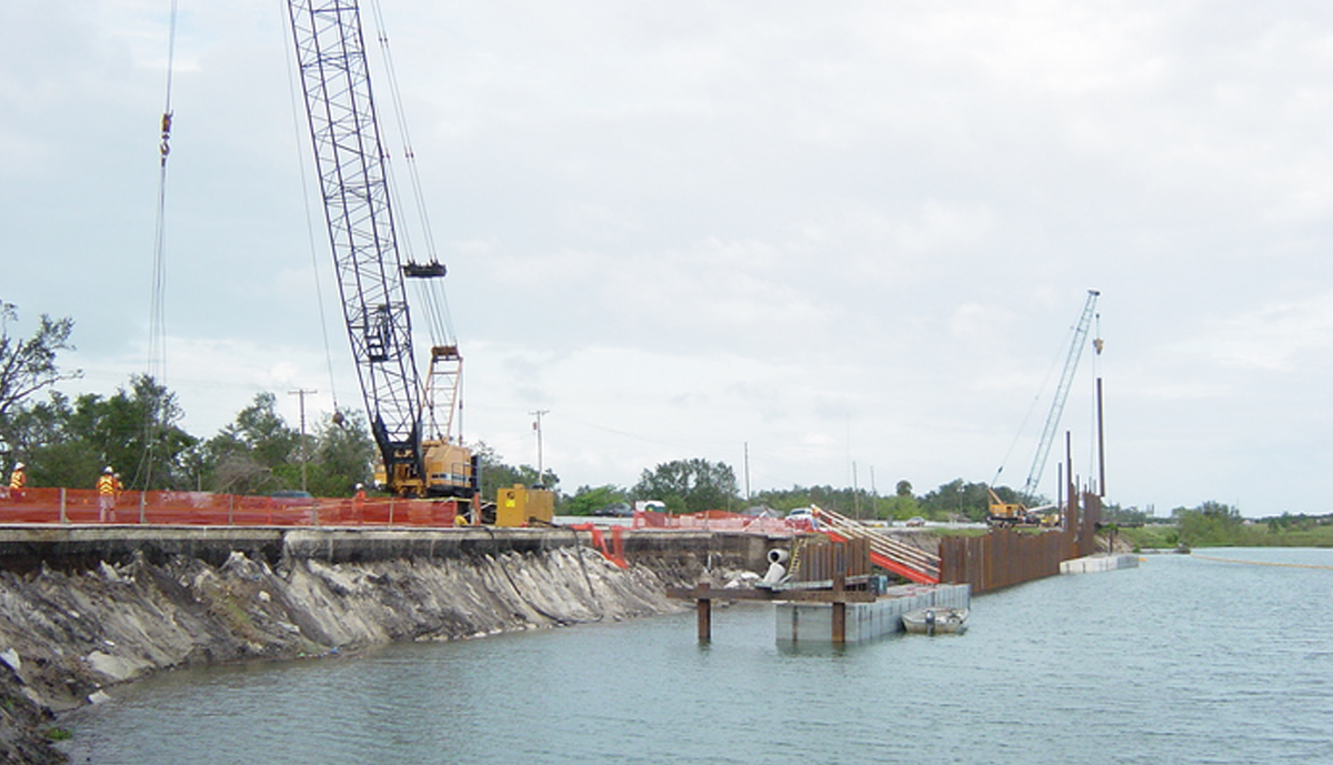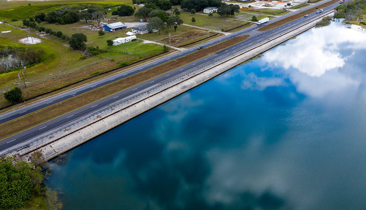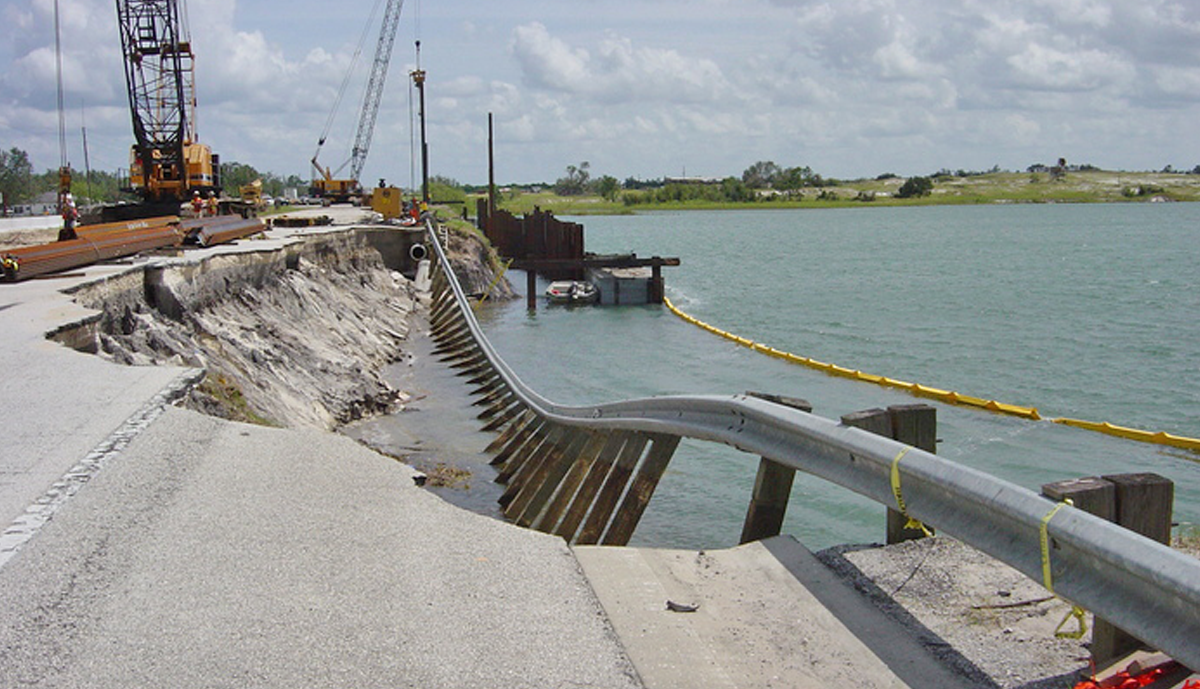 During Hurricane Charley in 2005, SR 60 sustained significant damage to the eastbound lanes due to erosion of the shoulder and undermining of the pavement along a stretch of this main roadway east of Lake Wales, Florida. The repair entailed driving two permanent rows of steel sheet piling, separated by 20’ buffer, for a distance of 1,220’ where the shoulder had been eroded. The void between the rows of sheeting was filled with flowable fill and capped with concrete, creating a new stable shoulder which enabled the reconstruction of the damaged highway.