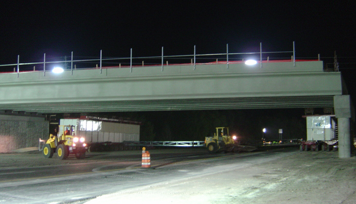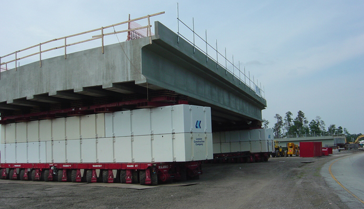 Florida Department of Transportation officials approached Leware after Contract award with a proposal to accomplish something that had never before been done in the United States: Fabricate and erect complete bridge spans over an Interstate highway using Self-Propelled-Modular-Transporter technology (SPMT). After the existing bridge spans were removed, two new 143’ spans were fabricated offsite while new foundations were constructed. These 1,600 ton units were then raised and transported 0.3 miles to be set over Interstate 4 in one night each, eliminating numerous nightly lane closures required for convention construction.