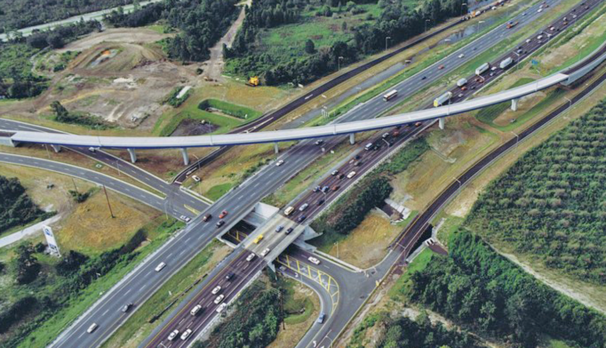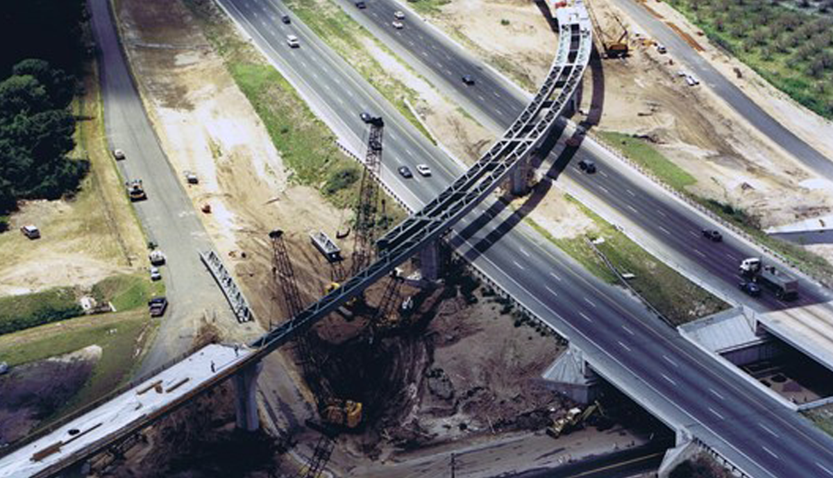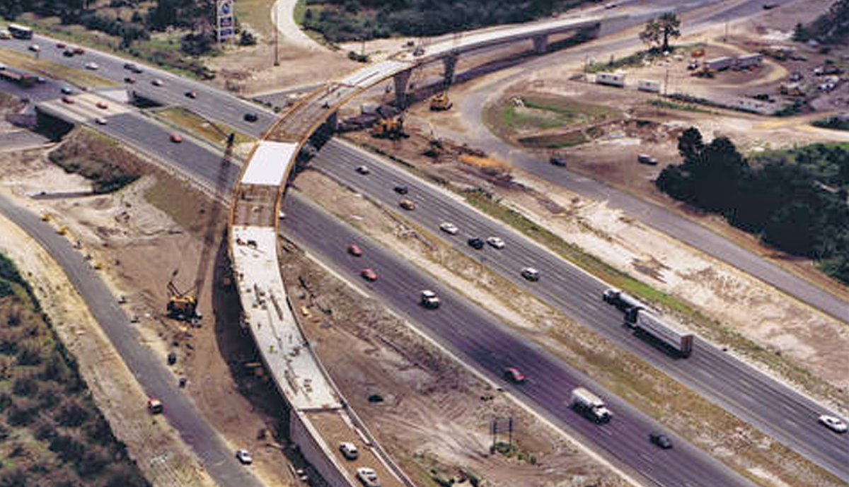Florida’s first privately funded Interstate interchange, this 1,247’ Flyover incorporated 8 spans, the longest being 186’6”. The bridge deck is supported by twin trapezoidal box girders which utilized Framed-In Cap Beams at 3 of the 7 piers.