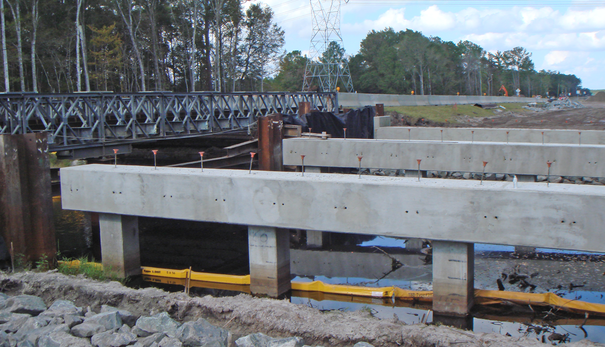 Located in the rural area between Baldwin and Callahan, this project consisted of reconstruction of 17 miles of US-301 from two lanes to a four-lane divided highway. Twin multi-span low level bridges founded on 24” concrete piling supporting flat slab cast-in-place decks were built at five creek locations. A twin single span FIB girder bridge was built over the Norfolk & Southern Railroad.