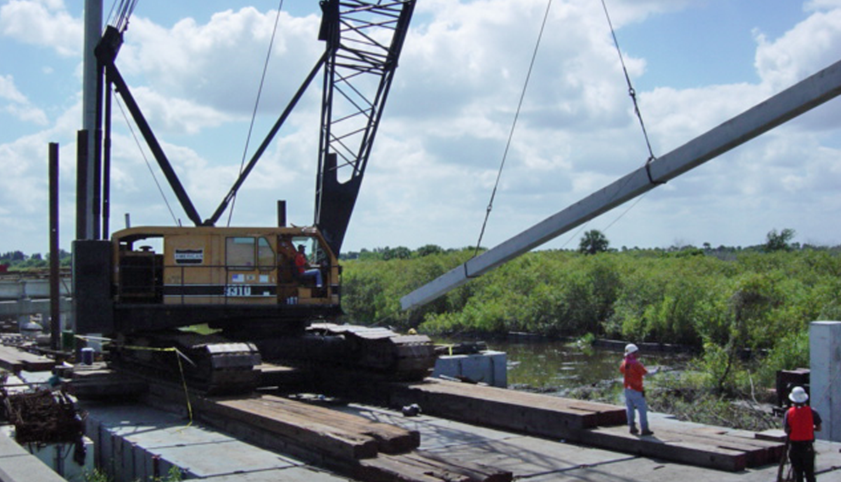 As part of the Emergency Evacuation Route for the east coast of Central Florida, 4.67 miles of US 192 were improved across the St. John River floodplains. Existing two lane crossings were replaced with twin 13 span structures 1,066’ in length over the River, a 263’ five span bridge over the Relief canal and a 66’ span over Sawgrass Creek. Concrete sheet pile walls at each abutment in conjunction with the lengthened bridge provided an additional 300’ of floodplain relief over the pre-existing condition.